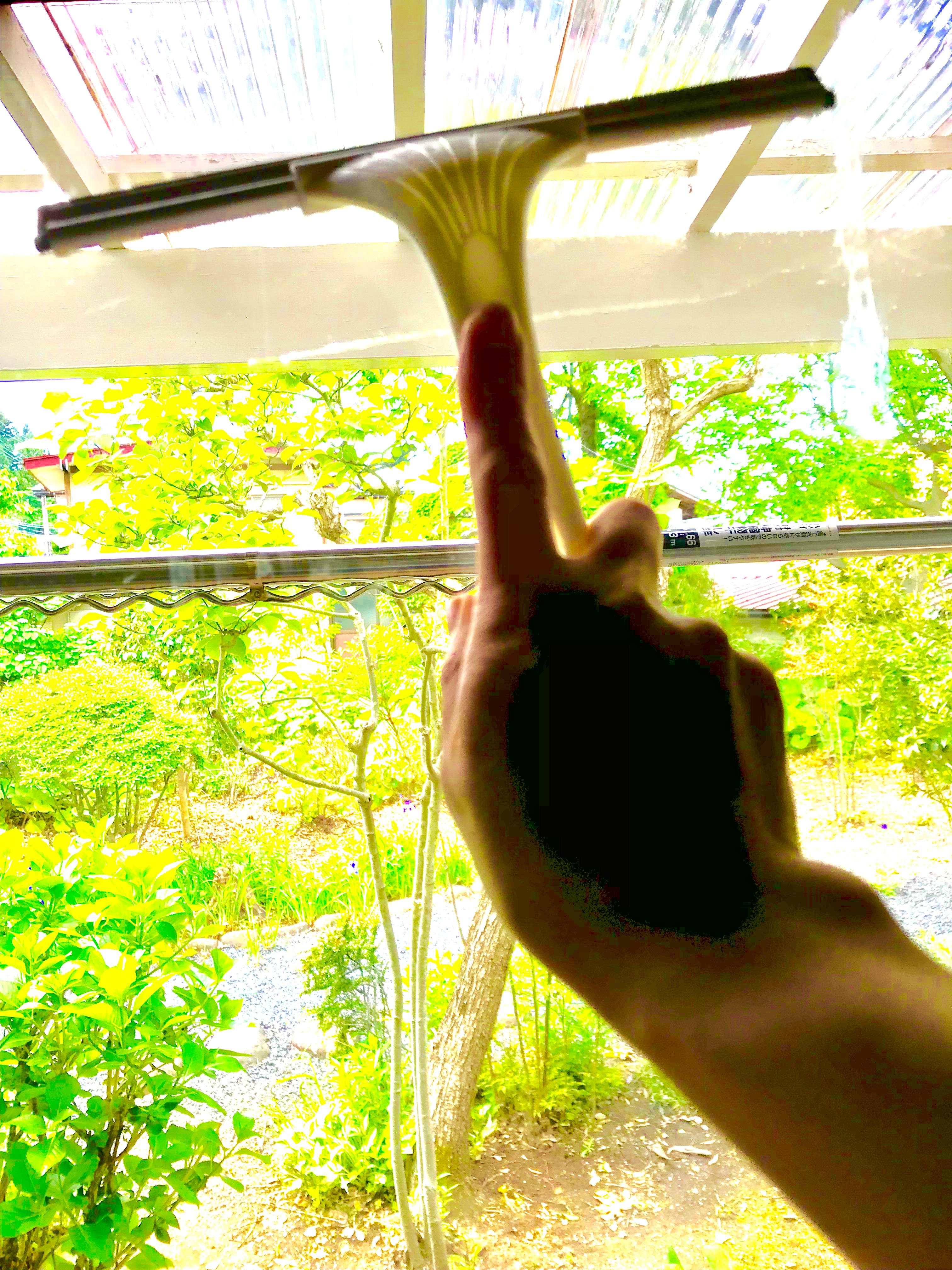窓ガラスはタオルで水拭きした後、スクイージーで水切りすればわずか数分でピカピカになります。